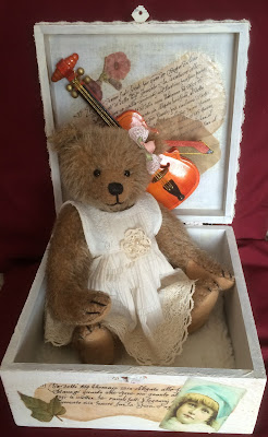 Babette ist ein 25 cm großes Bärenmädchen aus Schultemohair, sie hat 5 Gelenke, schwarze Glasaugen und ihre gestickte Nase ist leicht gewachst. Sie trägt ein Sommerkleidchen und kann mit diesem schönen Holzkästchen zu dir reisen.